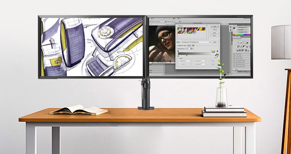 To simplify things though, a full-motion dual-monitor desk mount can hold two monitors at the same time. For added functionality, choosing a gas-spring dual monitor mount is recommended although you’re adding a lot on cost when you go gas-spring over standard mount.